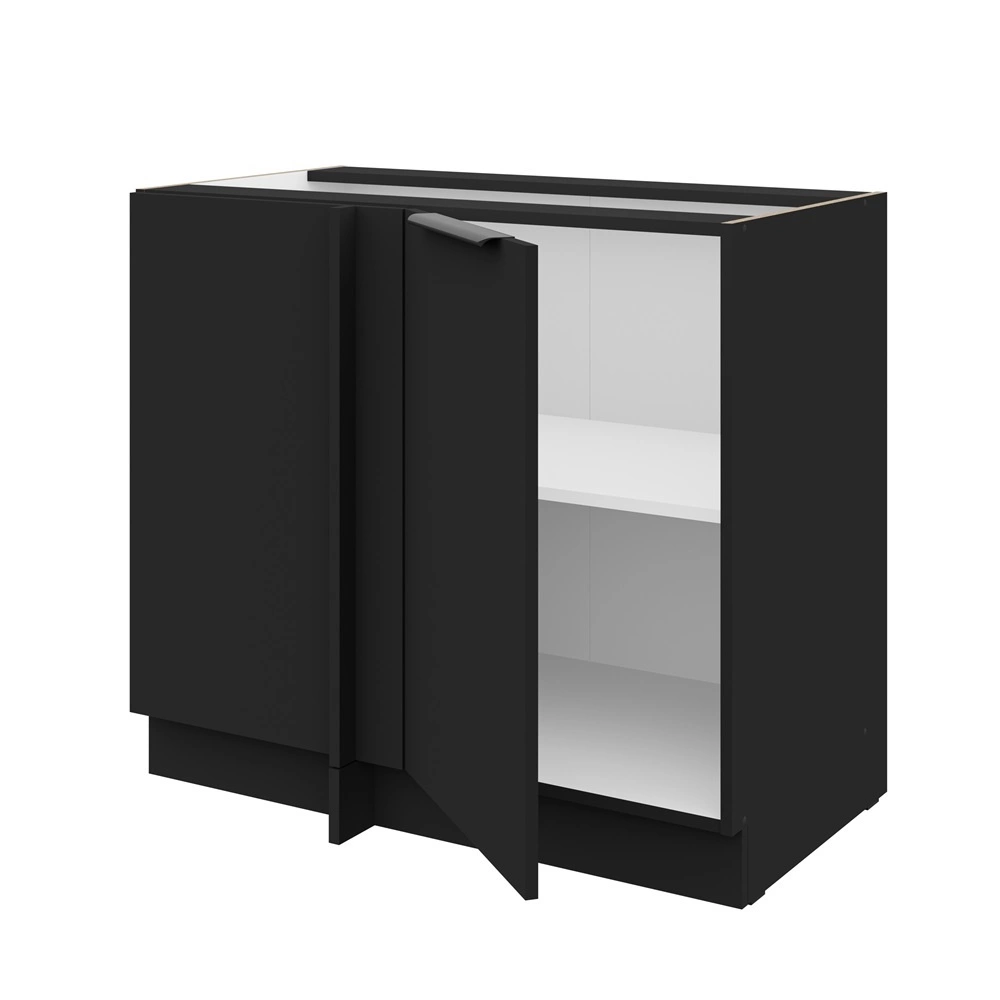 Dvířka rohových kuchyňských skříněk v černé barvě s matným povrchem jsou vyrobeny z laminované desky. Přední strana je vysoce odolná proti vlhkosti a náhodnému poškození. Stylovým doplňkem čel kuchyňských skříněk je černá, kovové okrajové držáky, které kromě své primární funkce dodávají zvláštní nádech.