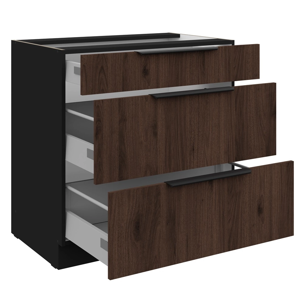 Kuchyňská skříňka Brianza se zásuvkami 80 cm v barvě ořech okapi/černá patří do kategorie modulárního kuchyňského nábytku, ze kterého lze vytvořit libovolnou kombinaci.