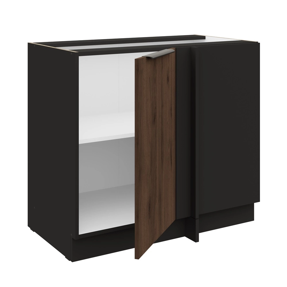 Dvířka rohových kuchyňských skříněk v barvě ořech okapi jsou vyrobeny z laminované desky. Přední strana je vysoce odolná proti vlhkosti a náhodnému poškození. Stylovým doplňkem čel kuchyňských skříněk je černá, kovové okrajové držáky, které kromě své primární funkce dodávají zvláštní nádech.