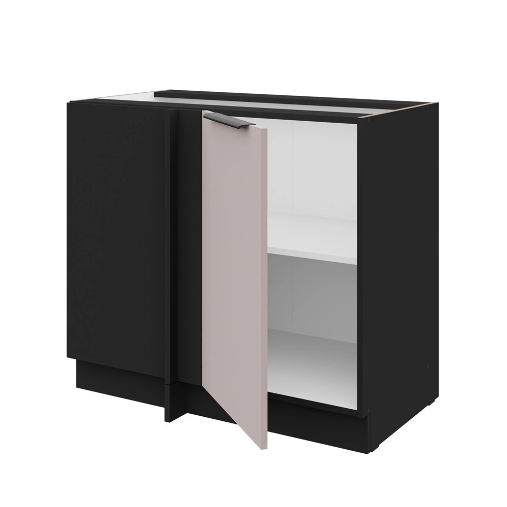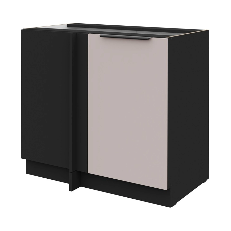 Dvířka rohových kuchyňských skříněk v béžové barvě jsou vyrobeny z laminované desky. Přední strana je vysoce odolná proti vlhkosti a náhodnému poškození. Stylovým doplňkem čel kuchyňských skříněk je černá, kovové okrajové držáky, které kromě své primární funkce dodávají zvláštní nádech.