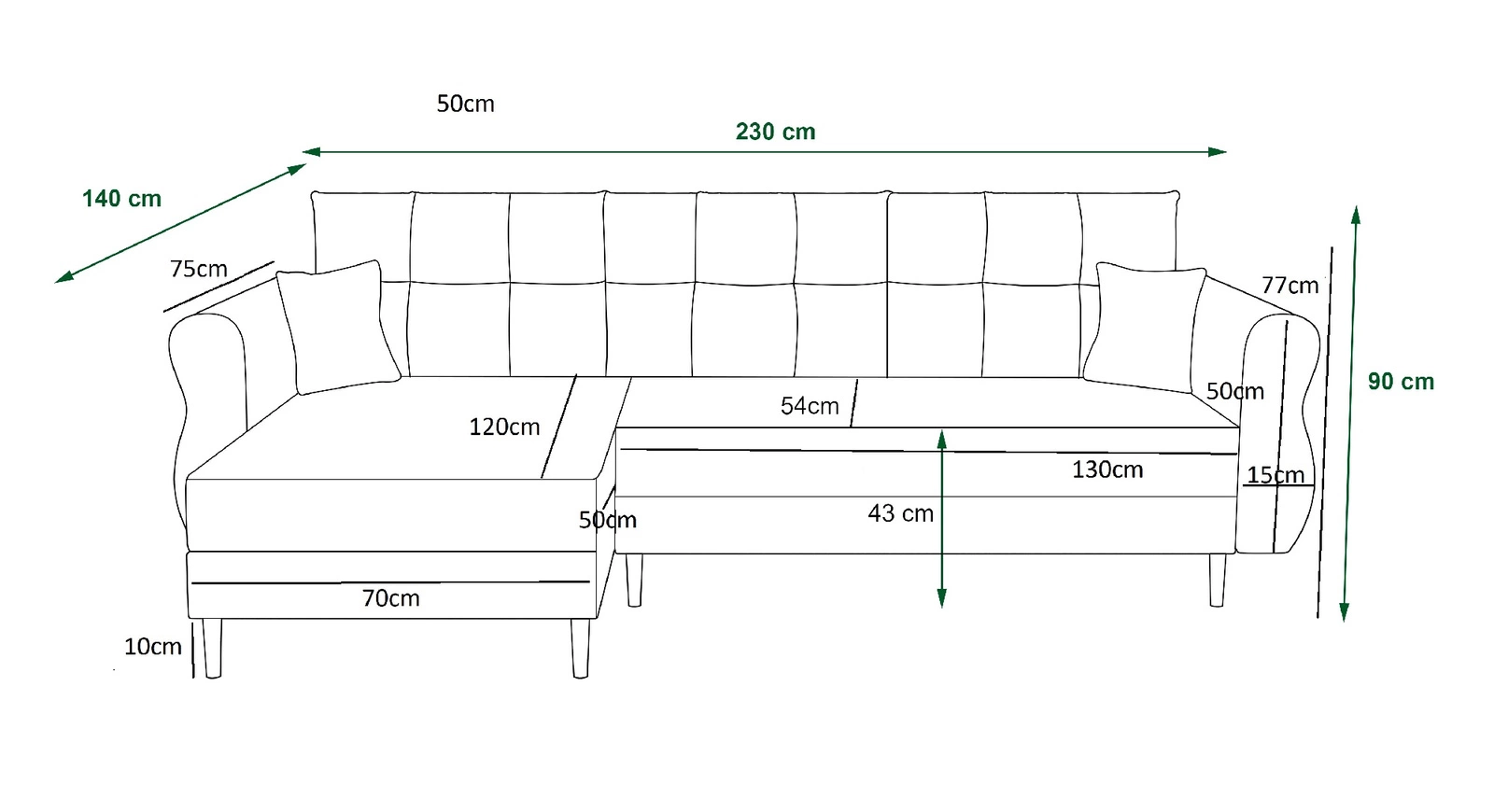 Díky svým optimálním rozměrům a široké funkčnosti je rohová pohovka s funkcí spaní ideální jako rohová pohovka do obývacího pokoje nebo jako rozkládací rohová pohovka do pokoje teenagera. Šířka rohu 230 cm, výška 90 cm a hloubka 140 cm. Spací plocha rohové jednotky je 131x200 cm. Výška sedadla nábytku je 43 cm. Polyuretanová pěna T30 je materiál, z něhož je vyrobeno sedadlo rohu. Zádová opěrka polštáře zaručuje pohodlný odpočinek po dlouhém dni, který vy i vaši hosté oceníte při posezení na této jedinečné rohové pohovce.