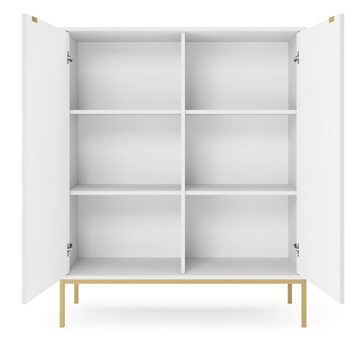 Bílá komoda Lovro 104 cm v moderním designu obohacená o zlaté doplňky potěší milovníky výrazných interiérů