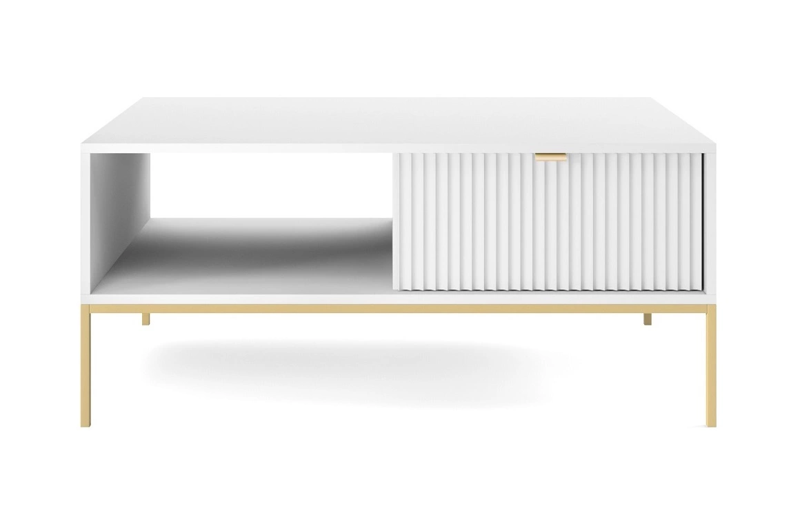 Konferenční stolek Lovro bílý se zásuvkami moderní design deska odolná proti rozlití zlaté kovové nohy