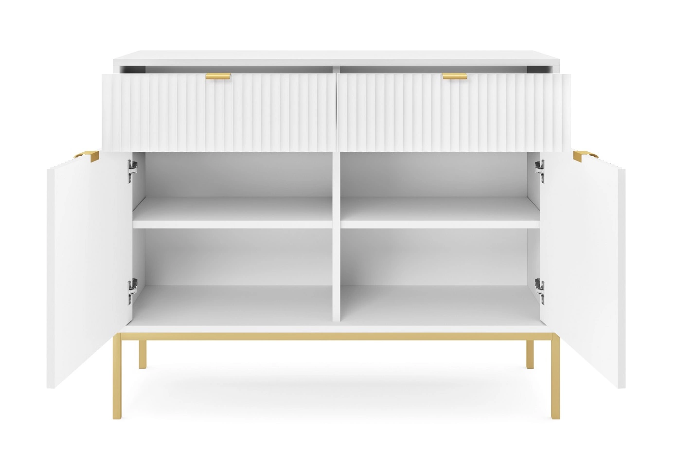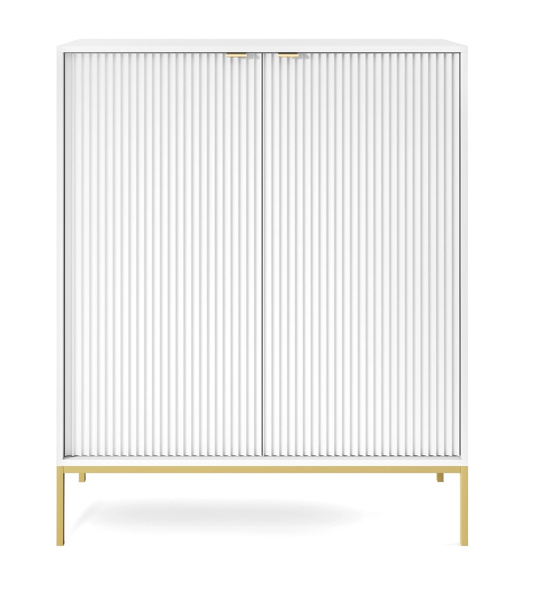 Rýhované fronda z MDF tloušťka 18 mm přidat zvláštní kouzlo. Stylové provedení čelních ploch nástěnné skříňky jsou rukojeti se zlatým okrajem. Design nábytku je rozmanitý a zlatý kovové nohy o výšky 20 cm.