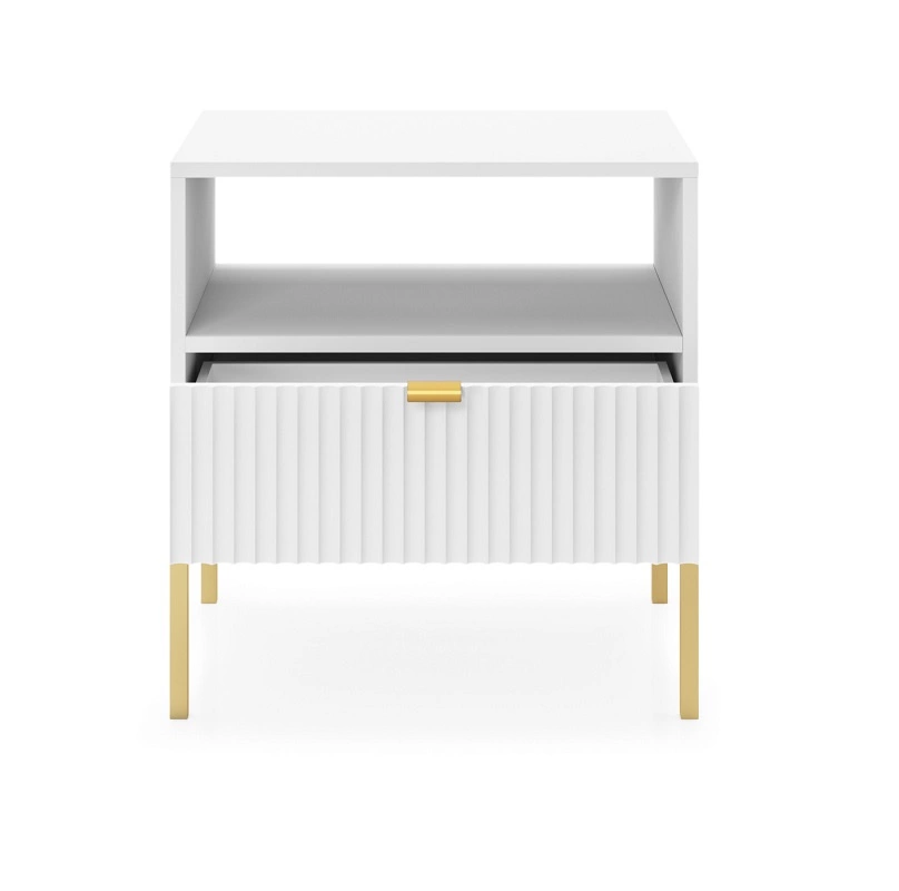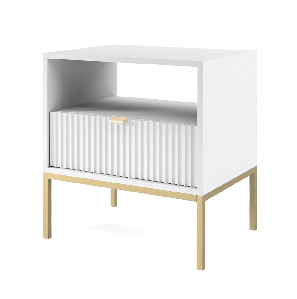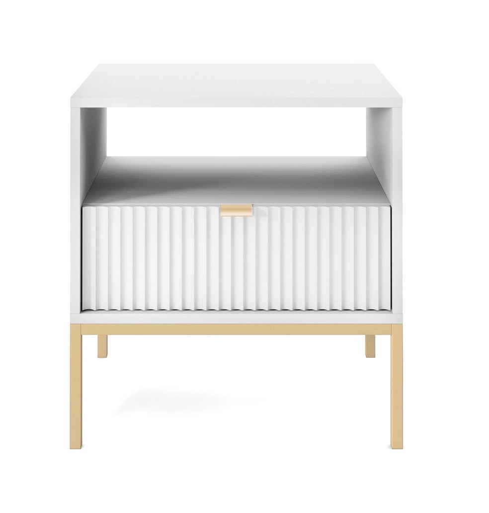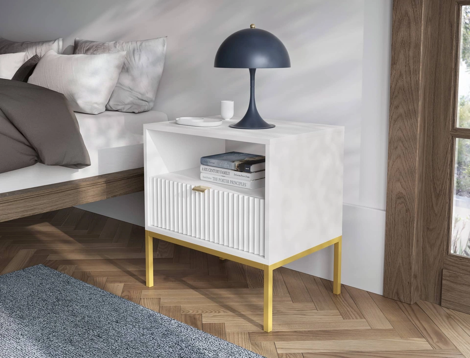 Lovro noční stolek se zásuvkou bílý vkusný drážkovaný dekor ideální skříňka do ložnice zlaté kovové doplňky