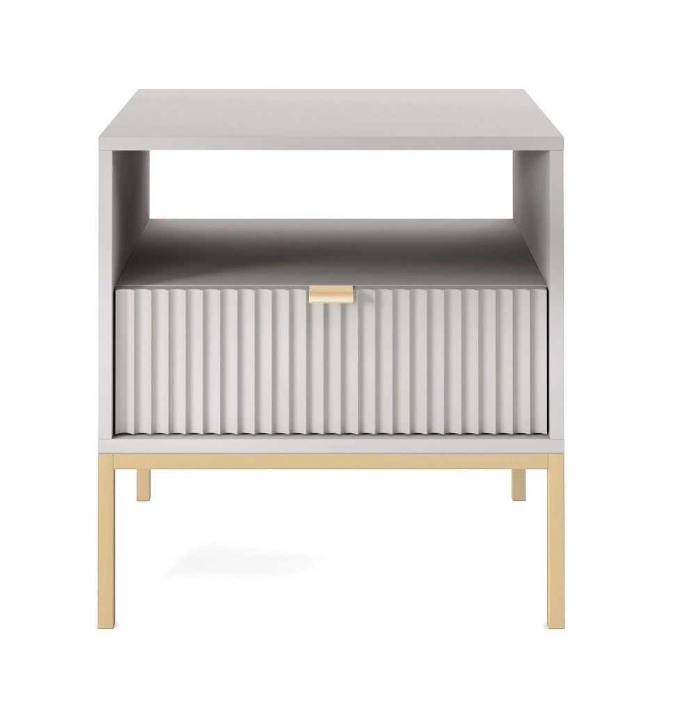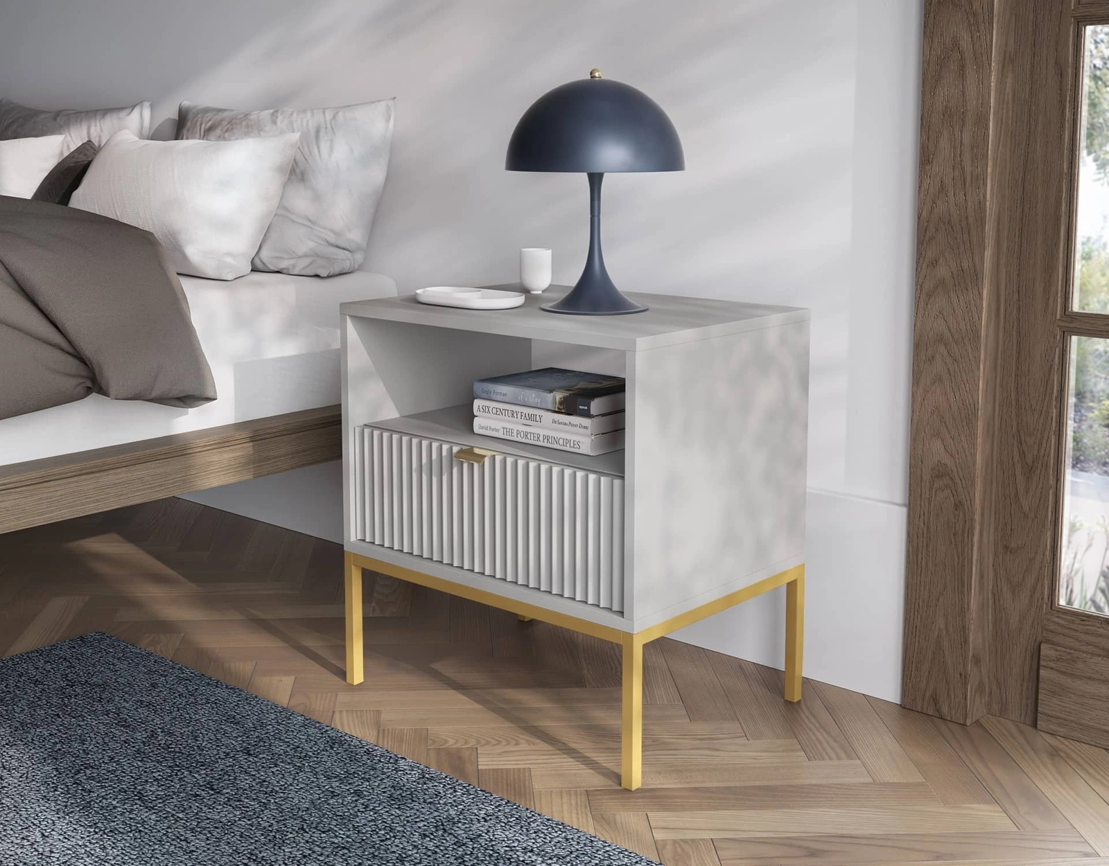 Lovro noční stolek se zásuvkou šedý vkusný drážkovaný dekor ideální skříňka do ložnice zlaté kovové doplňky