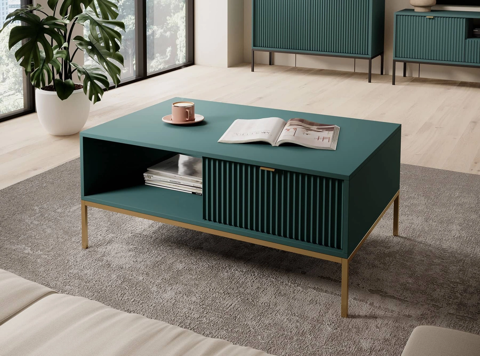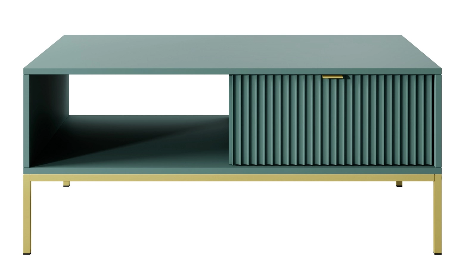 Konferenční stolek Lovro pastelově zelený se zásuvkami moderní design deska odolná proti polití zlaté kovové nohy
