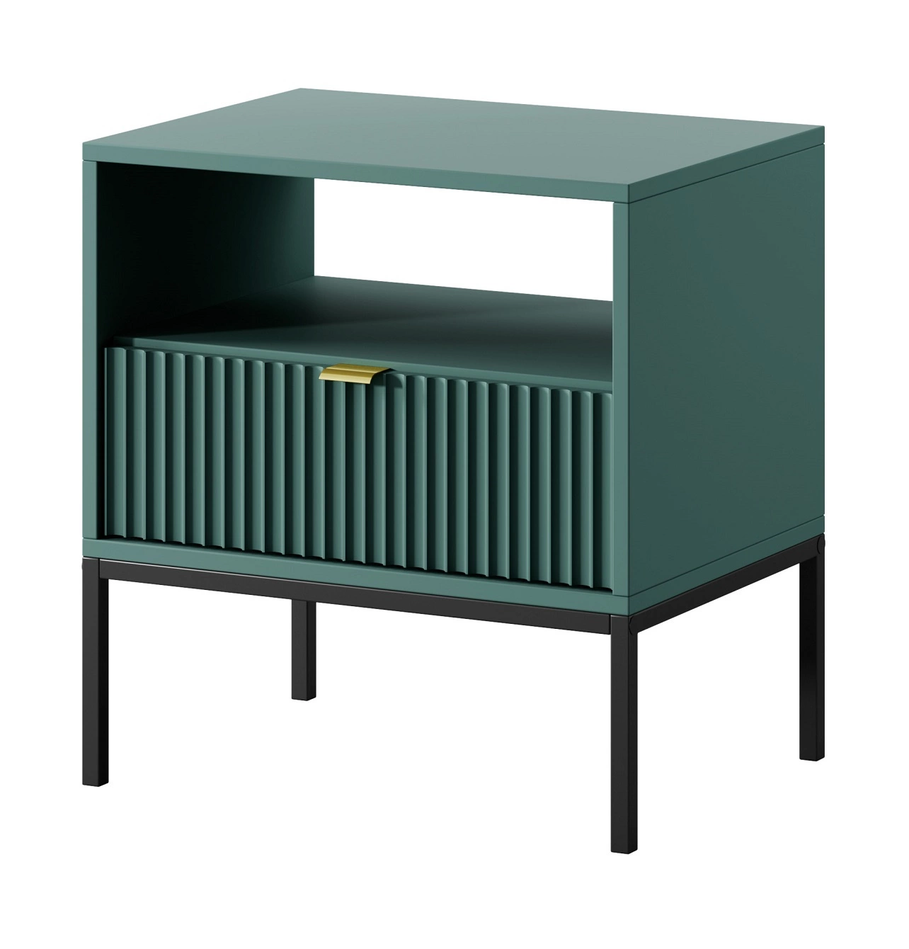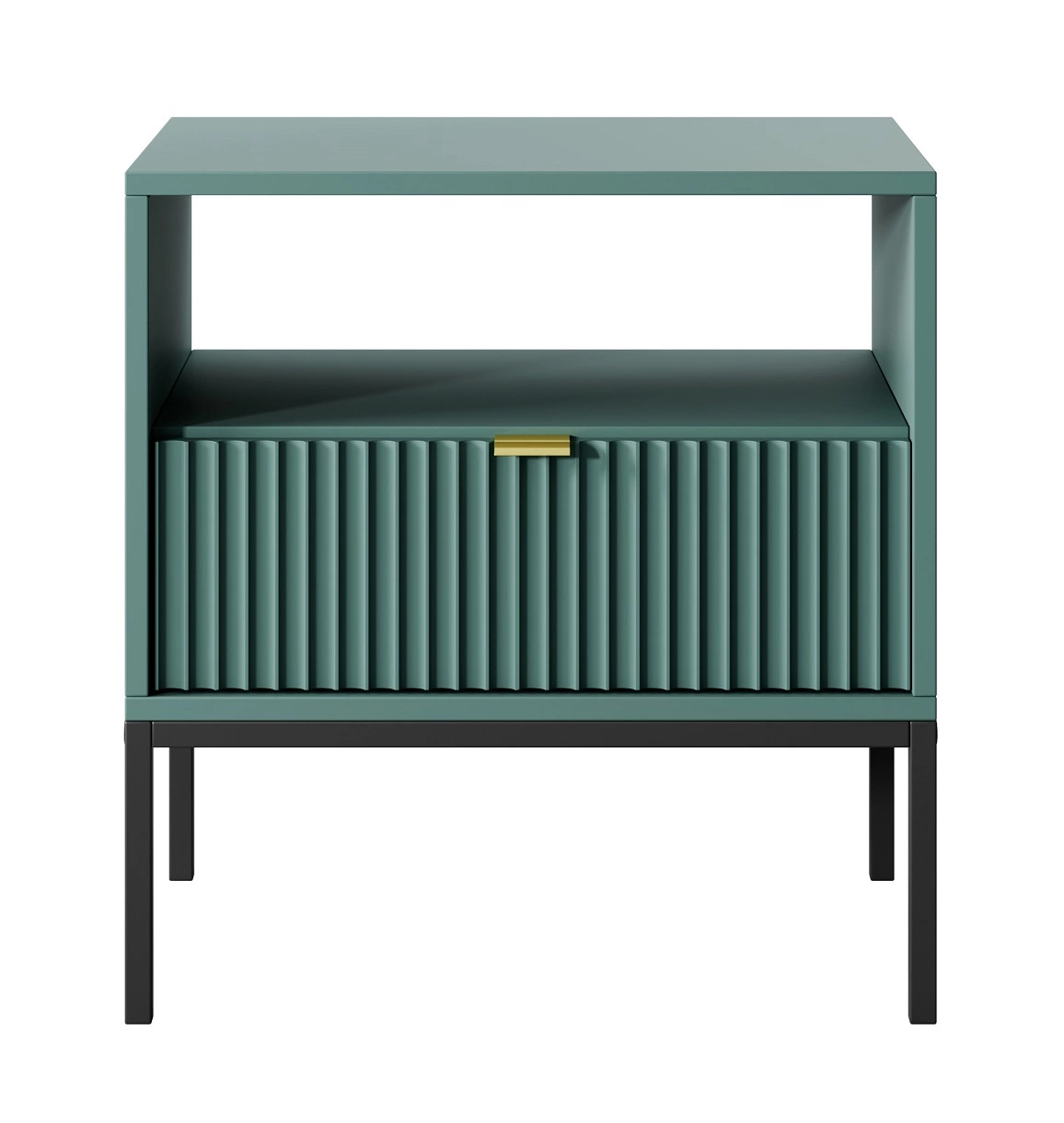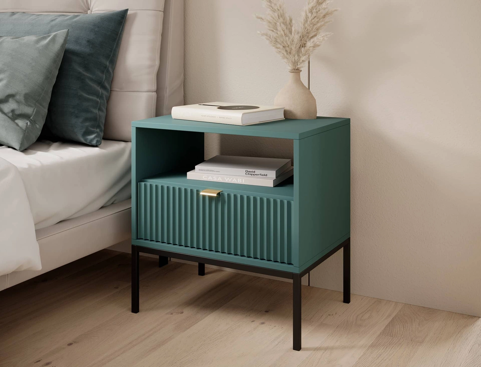 Lovro noční stolek se zásuvkou pastelově zelený vkusný drážkovaný dekor ideální skříňka do ložnice zlatá hrana rukojeť