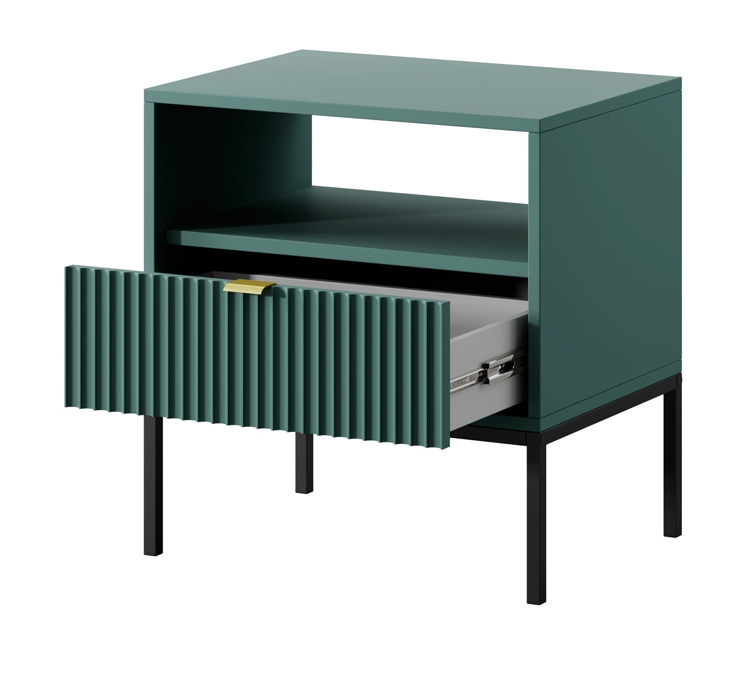 • Noční stolek Lovro je dokonalým doplňkem ložnice nebo pokoje pro mladé. Zelený odstín masivu v kombinaci s černým podstavcem je ideální pro loftový styl. Ozdobná drážkovaná čela dodávají interiéru originální a estetický nádech