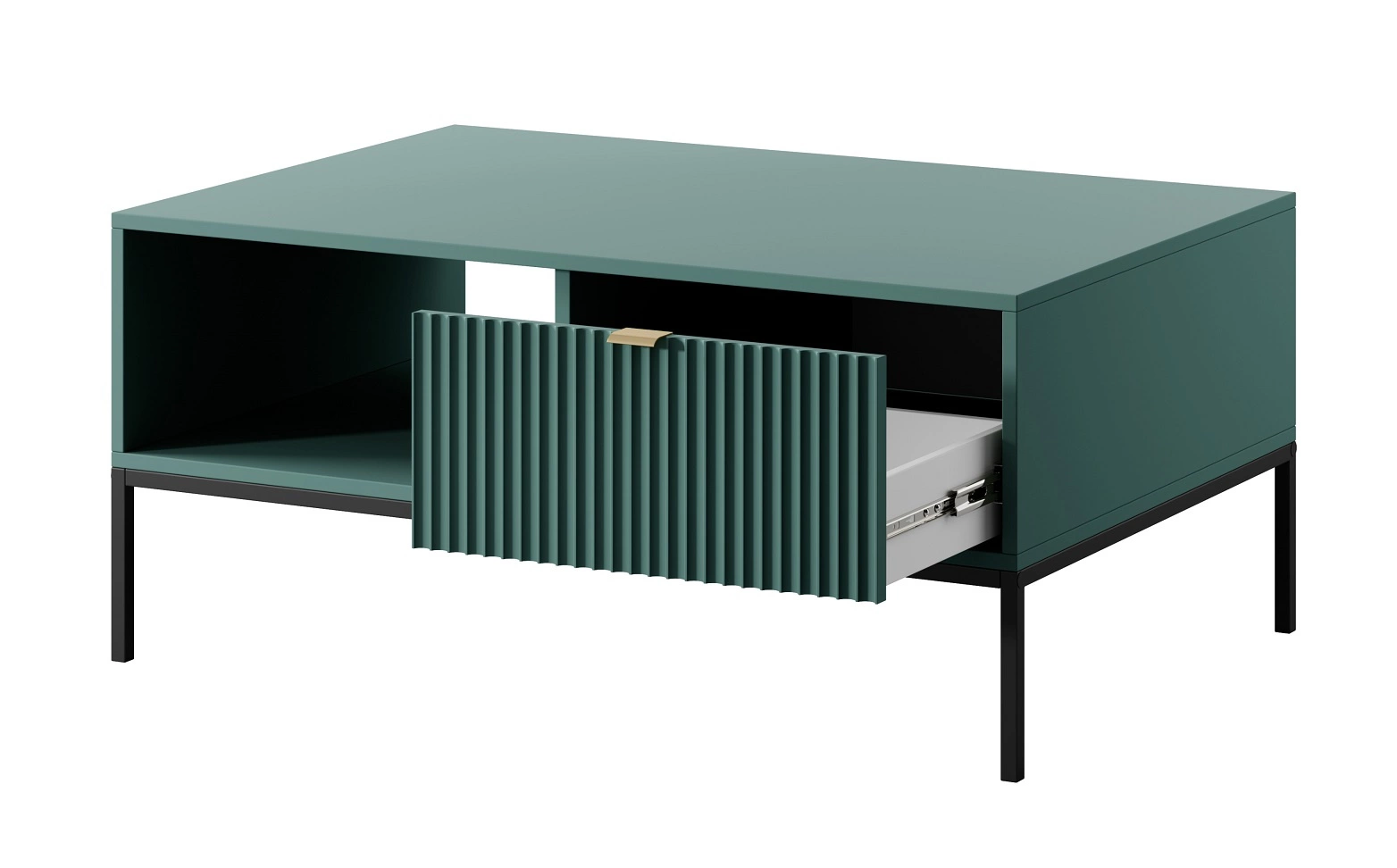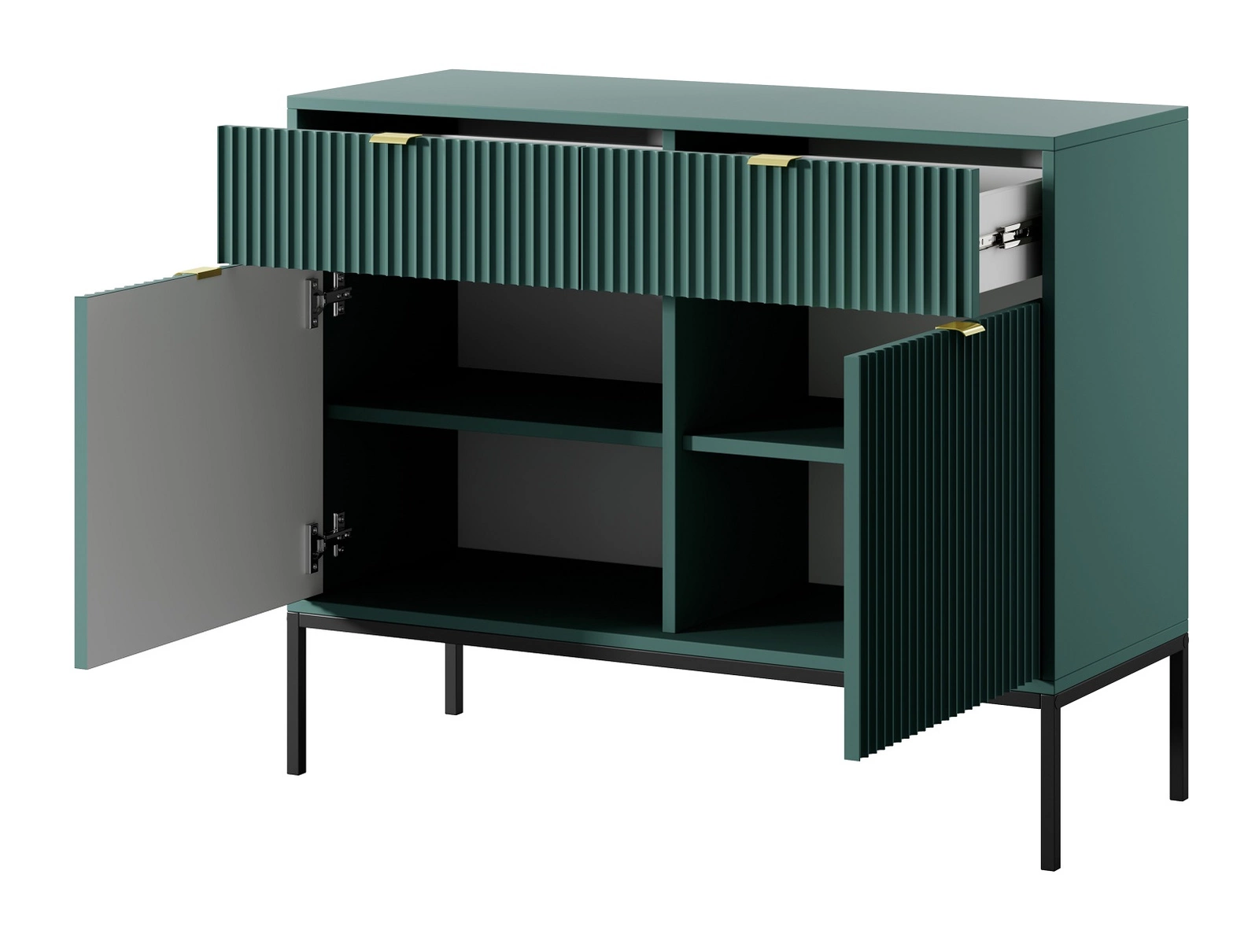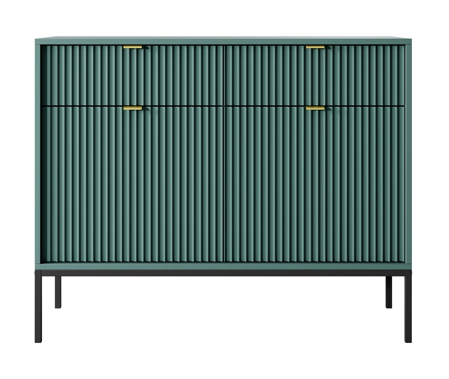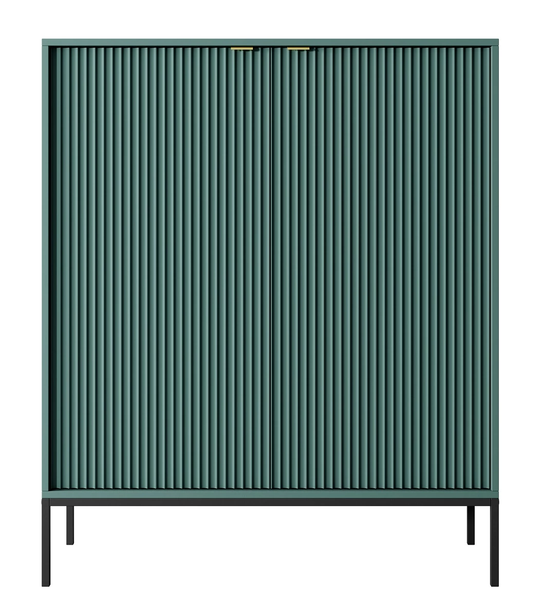 Rýhované fronda z MDF tloušťka 18 mm přidat zvláštní kouzlo. Stylové provedení čelních ploch nástěnné skříňky jsou rukojeti se zlatým okrajem. Design nábytku je rozmanitý černé kovové nohy o výšky 20 cm.
