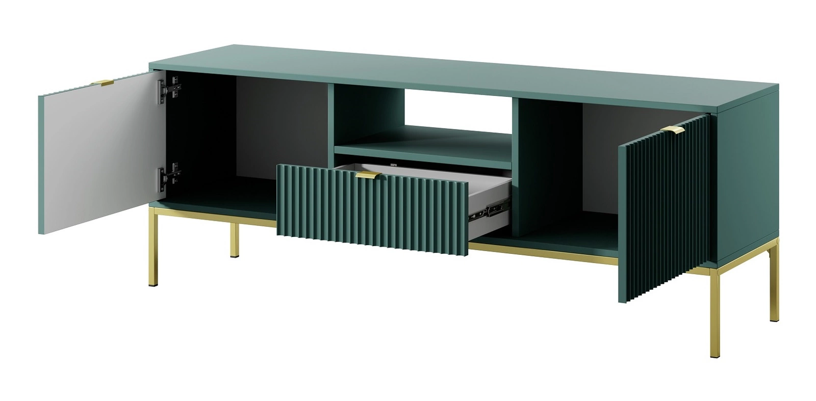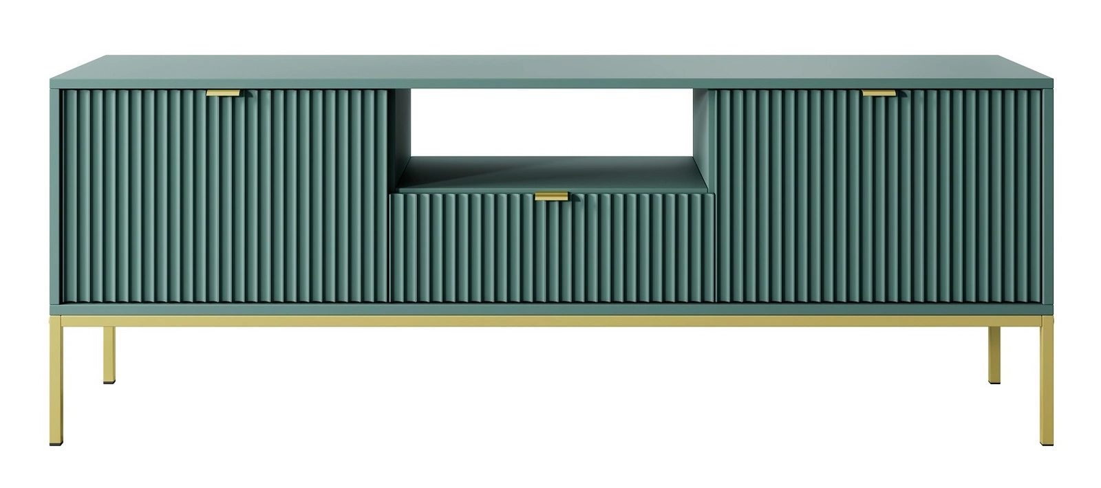 RTV skříňka Lovro 154 cm pastelově zelená moderní design potěší milovníky výrazných interiérů zlaté kovové doplňky