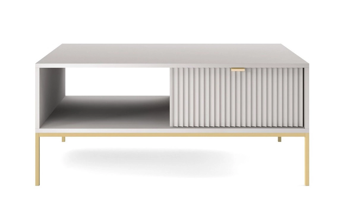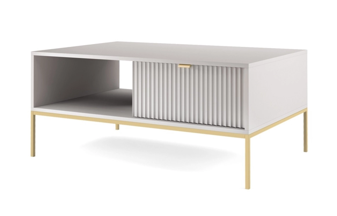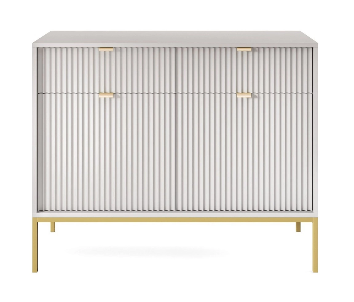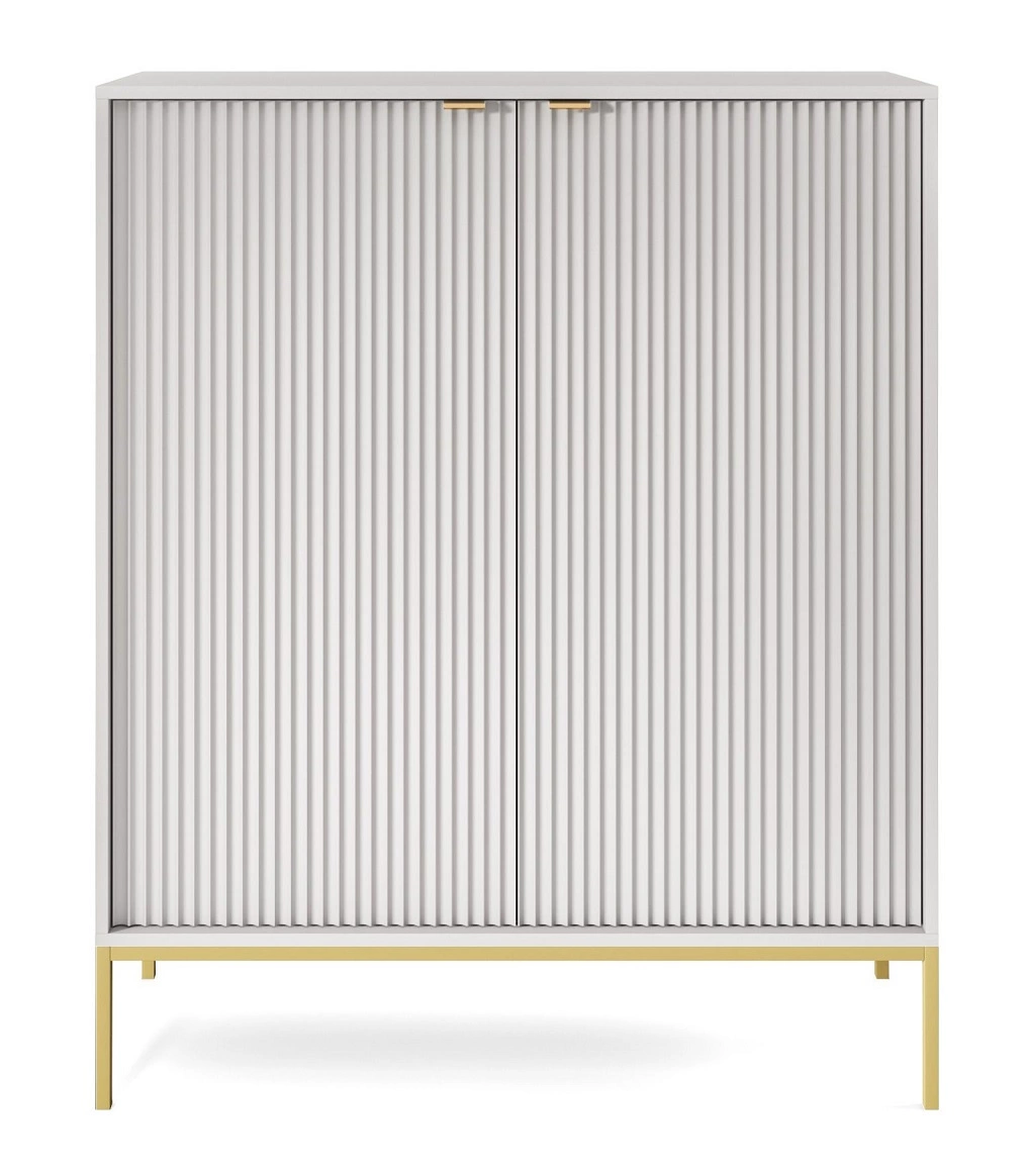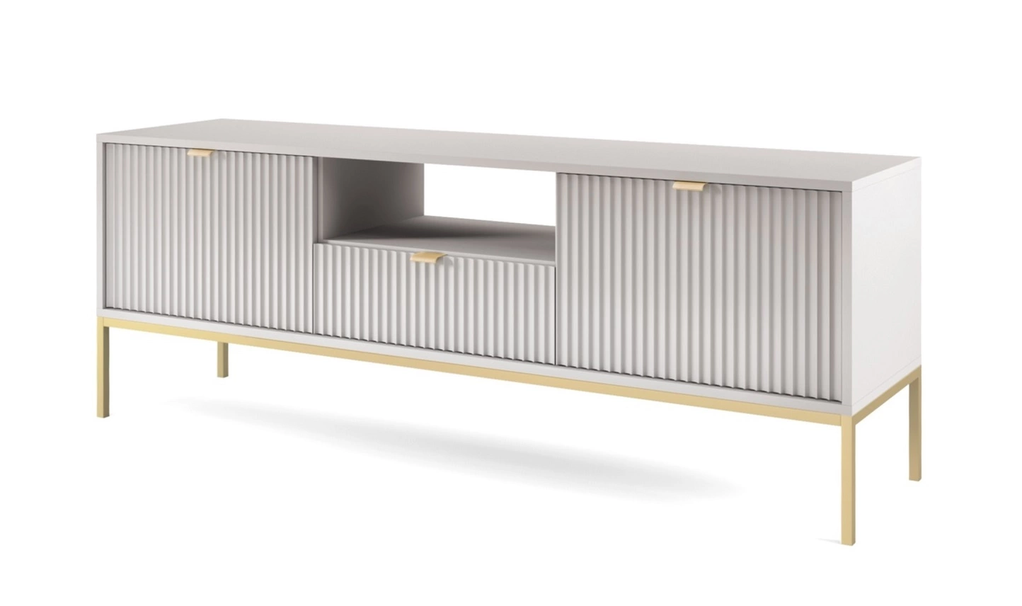 Rýhované fronda z MDF tloušťka 18 mm přidat zvláštní kouzlo. Stylové provedení čelních ploch nástěnné skříňky jsou rukojeti se zlatým okrajem. Design nábytku je rozmanitý a zlatý kovové nohy o výšky 20 cm.