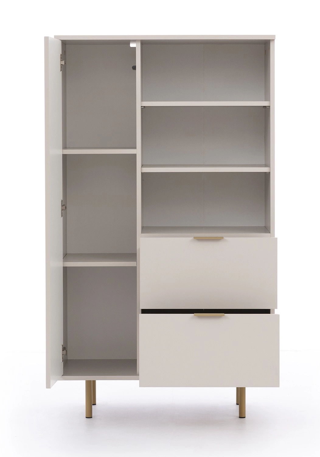 Komoda je vyrobena ze 1 dveře a 2 zásuvky. Dvířka komody se otevírají pomocí bezúchytkového systému push-to-open. Zásuvky jsou navíc vybaveny výsuvy s retardérem. Použité systémy zvyšují pohodlí a bezpečnost nábytku. Jemná béžová barva dobře se kombinuje s ostatními barvami, takže komoda Sula je skvělou komodou do obývacího pokoje, komodou do obývacího pokoje nebo komodou do ložnice. Komodu lze s úspěchem použít i jako kancelářský nábytek. Díky otevřený prostor s policemi lze použít i jako knihovnu nebo kancelářskou skříňku.