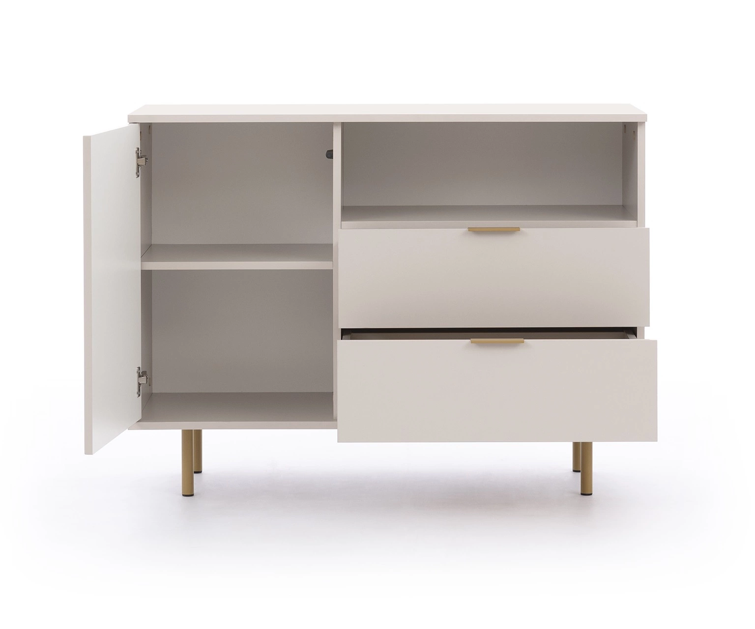 Komoda je vyrobena ze 1 dvířka, 2 zásuvky a otevřená police. Dvířka komody se otevírají pomocí bezúchytkového systému push-to-open. Zásuvky jsou navíc vybaveny výsuvy s retardérem. Použité systémy zvyšují pohodlí a bezpečnost nábytku. Nadčasová černá dobře se kombinuje s ostatními barvami, takže komoda Sula je skvělou komodou do obývacího pokoje, komodou do obývacího pokoje nebo komodou do ložnice. Komodu lze s úspěchem použít i jako kancelářský nábytek.