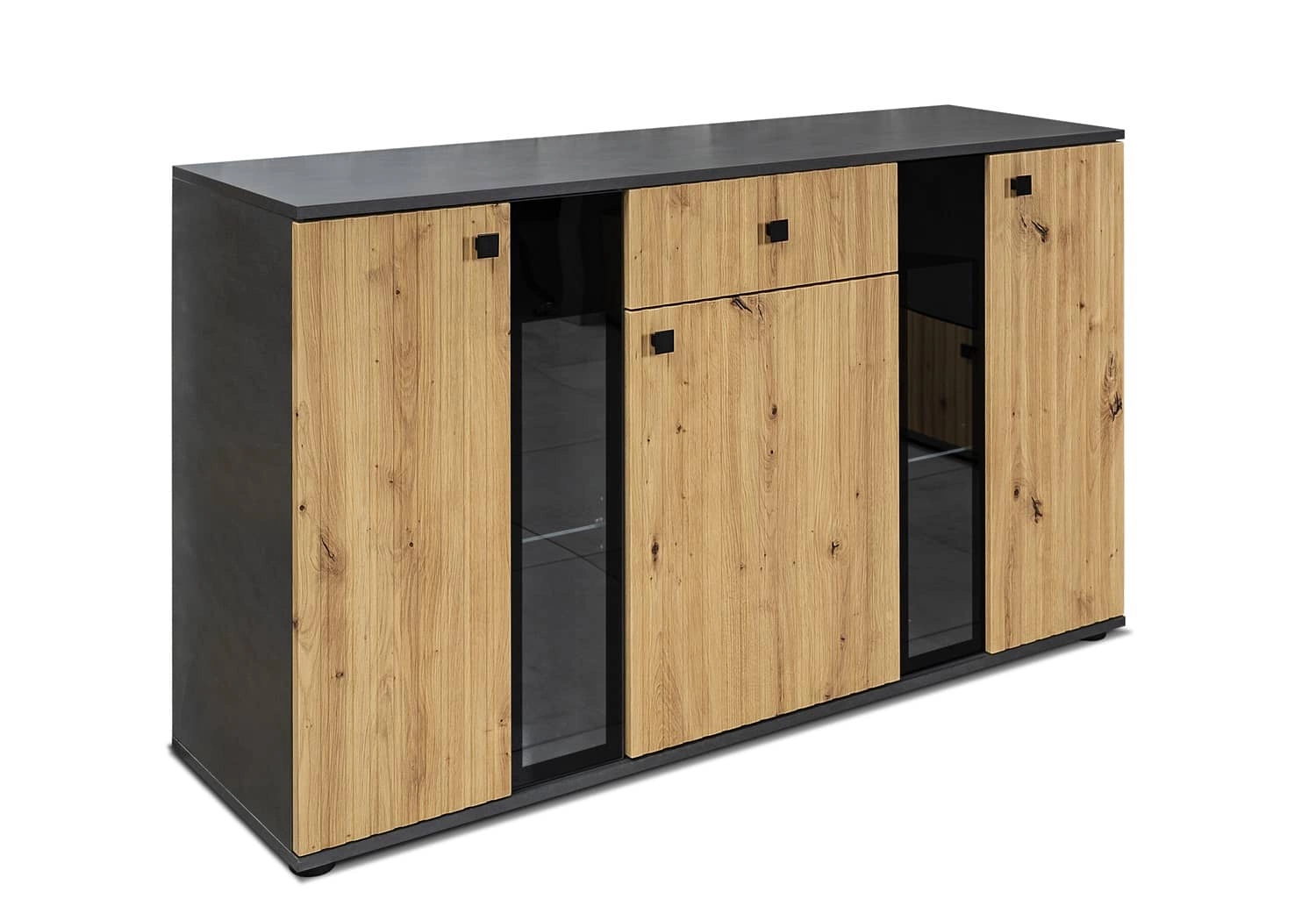 Nábytek je vyroben z 3 dveře a 1 zásuvky vysouvání na kuličkových ložiscích. Prosklené dveře pro vystavení stylového příslušenství. Skla vnějších dvířek komody jsou opatřena černým rámem. Komoda Senja je vybavena černými kovovými úchyty. Jemné a neobvyklé frézování přední části v oblasti lamelový vzor dodává lehkost a styl.