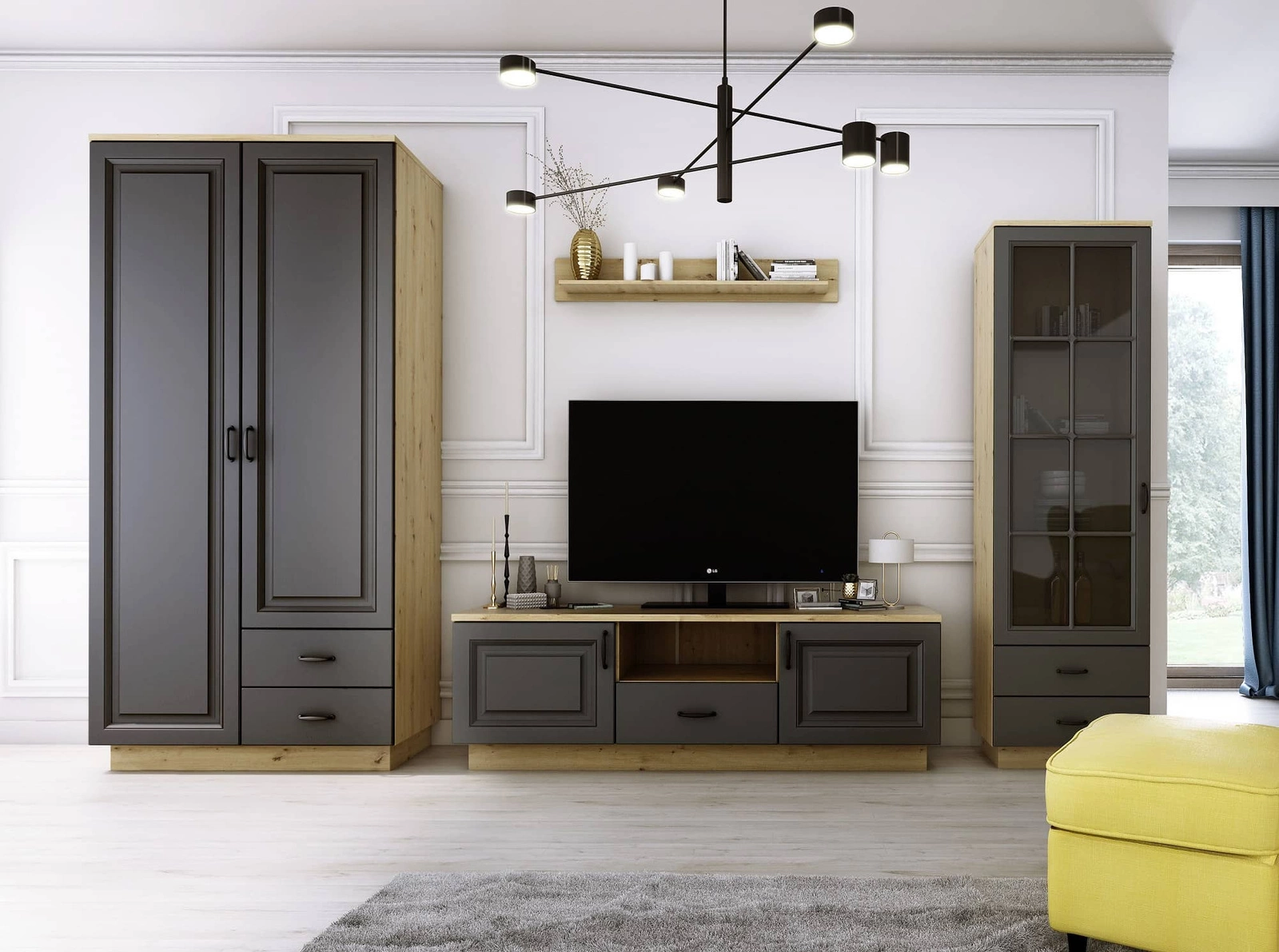Nábytková stěna Styl potěší milovníky osobitých interiérů. Přítomnost nástěnné skříňky se stane stylovou tečkou na závěr místnosti a dodá jí charakter a jedinečnou atmosféru. Expresivní kombinace dubová skříň s grafitovými čely dokončeno stylový řezák celý vzhled je velmi elegantní. Čelní strany obývací stěny doplňují kovové úchyty v černé barvě, které kromě své primární funkce dodávají nábytku jedinečný styl. Nástěnná jednotka si úspěšně najde své místo v interiérech s klasické, skandinávské a moderní styly.