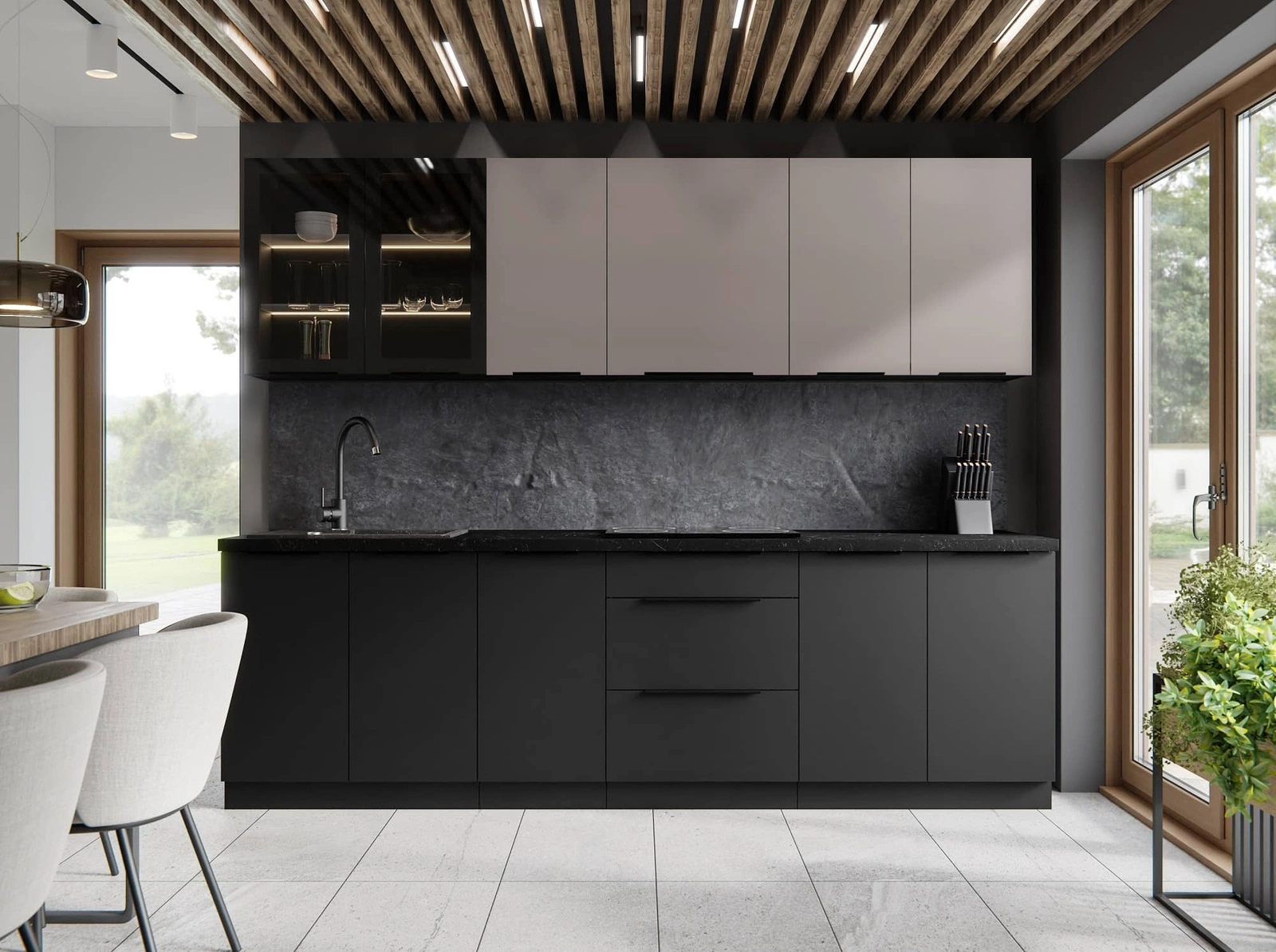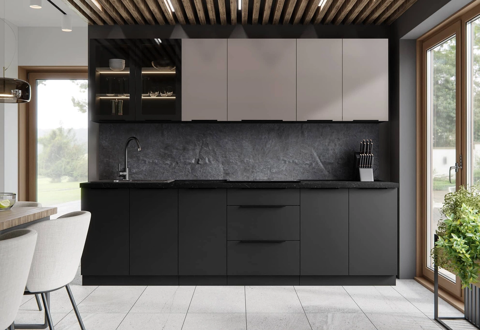 Sada kuchyňského nábytku Tarraco / Black v béžové / černé barvě je návrh hotové sady kuchyňského nábytku, která vypadá skvěle v moderních interiérech.