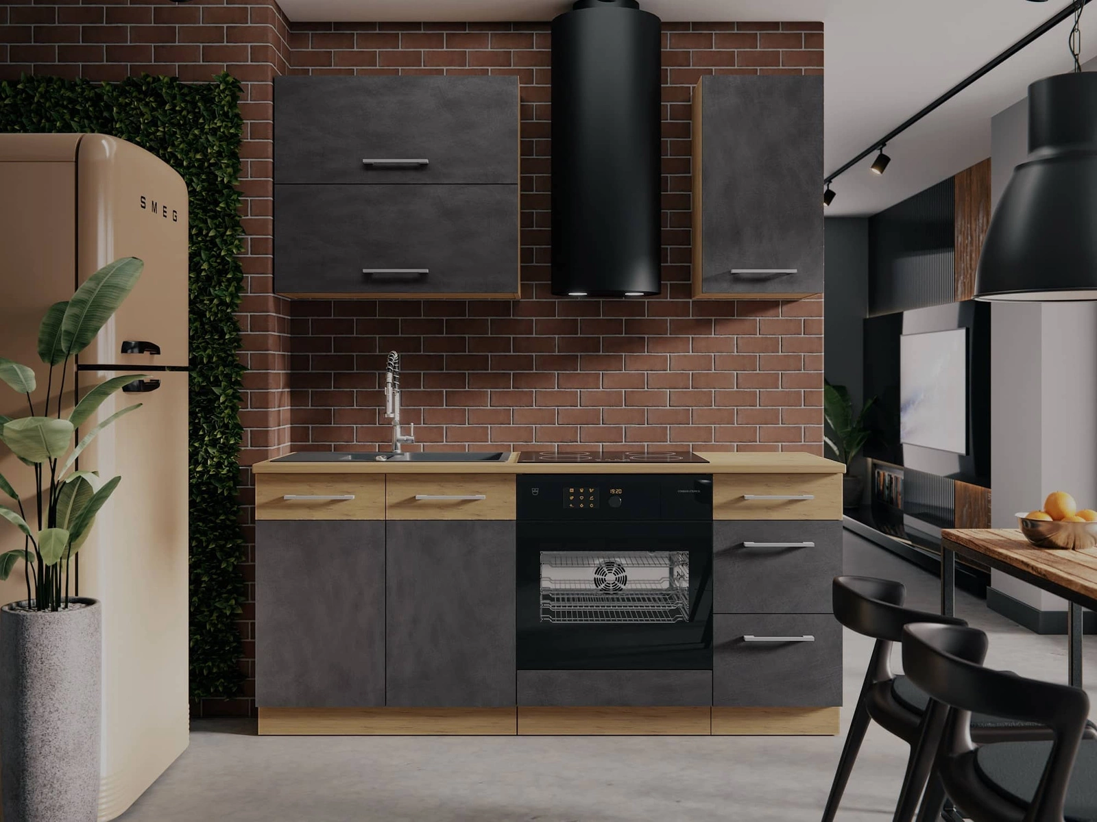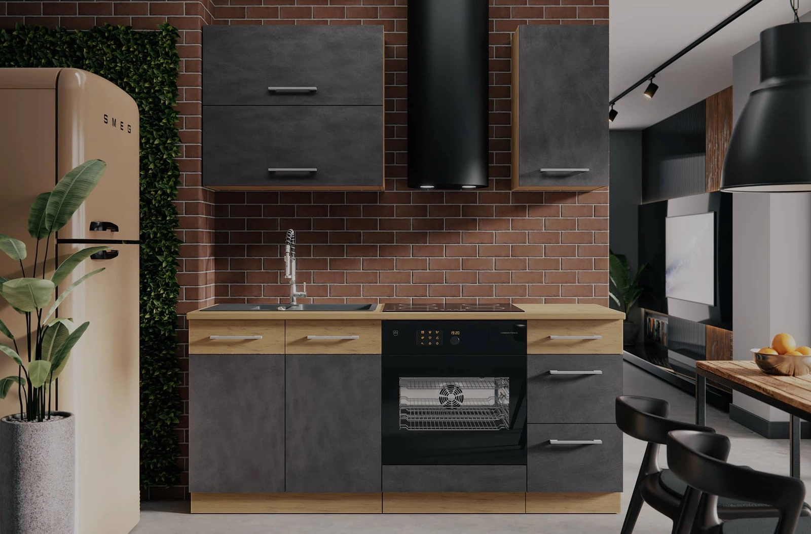 Díky svému univerzálnímu umístění se kuchyňský nábytek hodí do interiéru každé kuchyně. Matně zbarvená čela a korpusy v dekoru dubu dodávají kuchyňskému nábytku zvláštní charakter. Černá rukojeti podtrhnout eleganci kuchyňských skříněk.