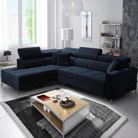 Rohová sedací souprava s funkcí spaní Nausa III tmavě modrá levá sametová stylová pohodlná rohová sedací souprava nastavitelné opěrky hlavy kontejner na lůžkoviny