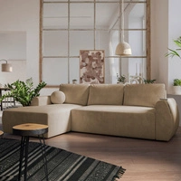 Rohová sedací souprava s funkcí spaní Colio béžová levá stylová rohová sedací souprava se zajímavým tvarem velurové tkaniny s dekorativním polštářem koule